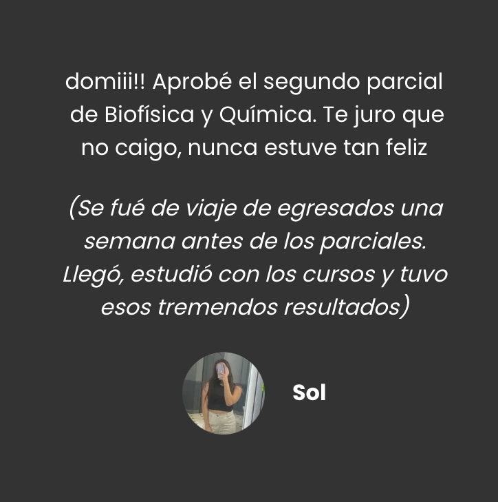 Soy Dominica, estudiante de último año de Ciencias de la Atmósfera en la UBA y apasionada por enseñar. Hace varios años doy clases para el CBC y UBA XXI, ayudando a muchos alumnos a aprobar con explicaciones claras y estrategias prácticas.
